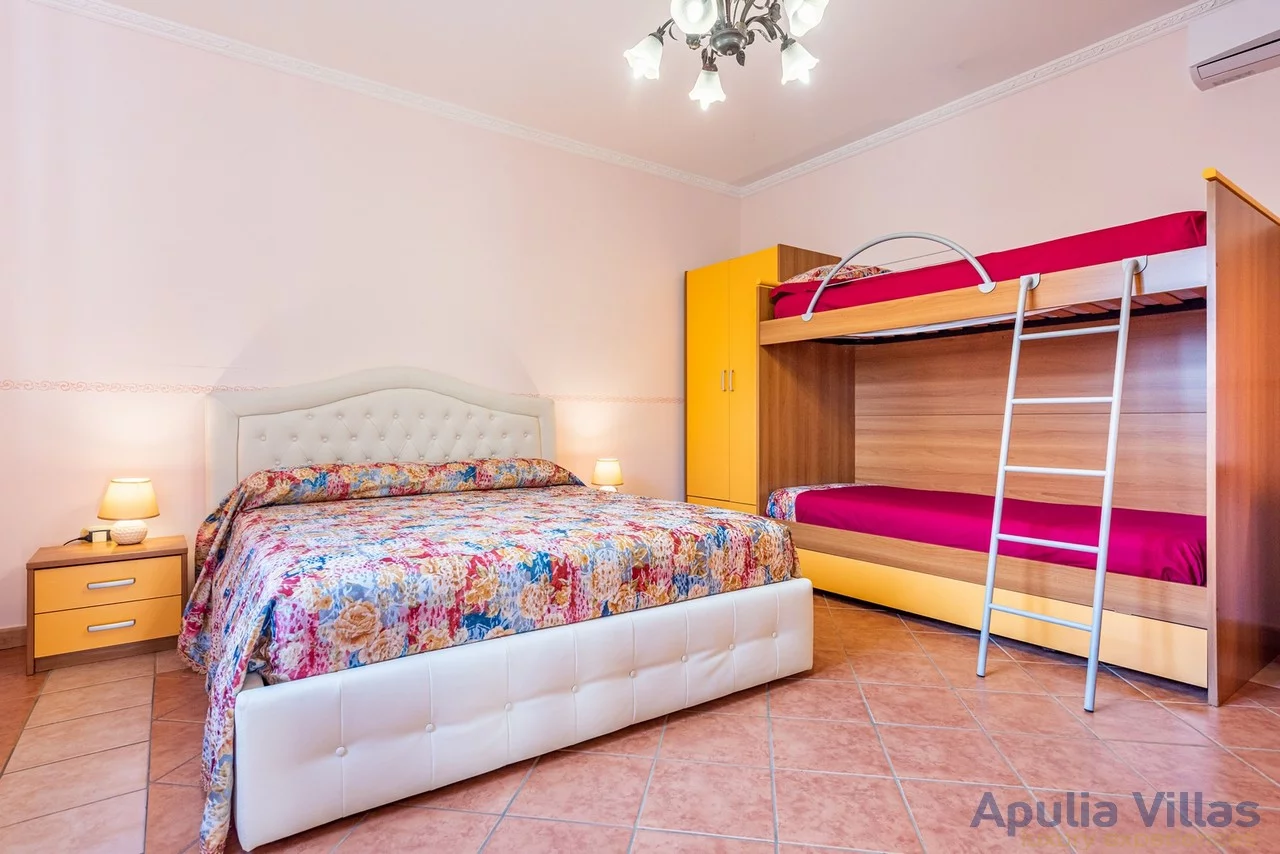 The villa features 3 spacious bedrooms, each with a double bed and a practical triple bunk bed. Each room can accommodate up to five people, making it ideal for families or groups of friends. In addition to a safe and air conditioning, each room also has its private bathroom with a shower to ensure the privacy of all guests.