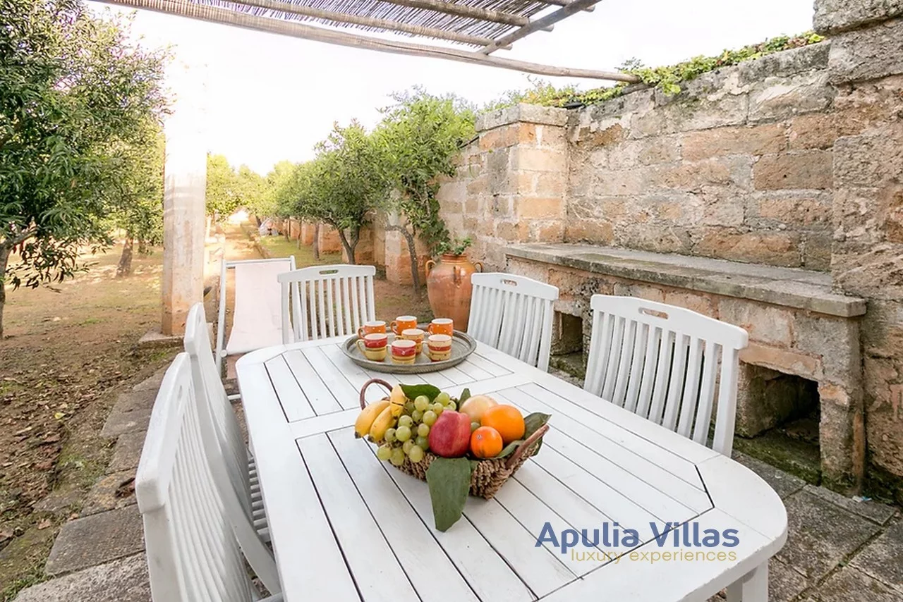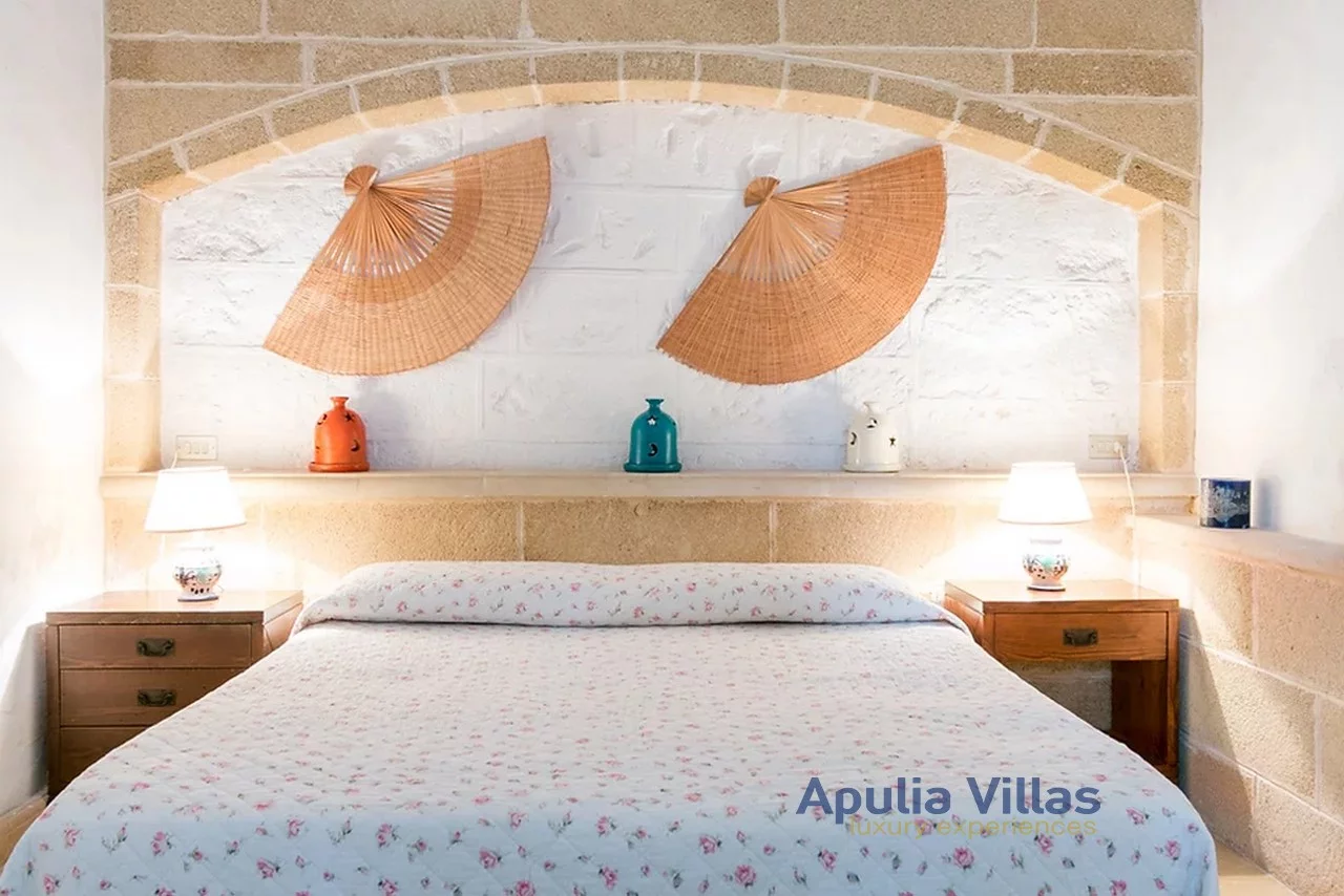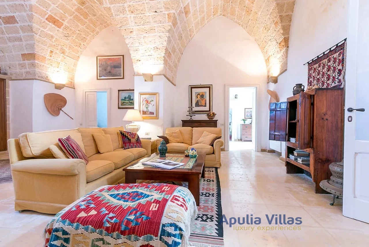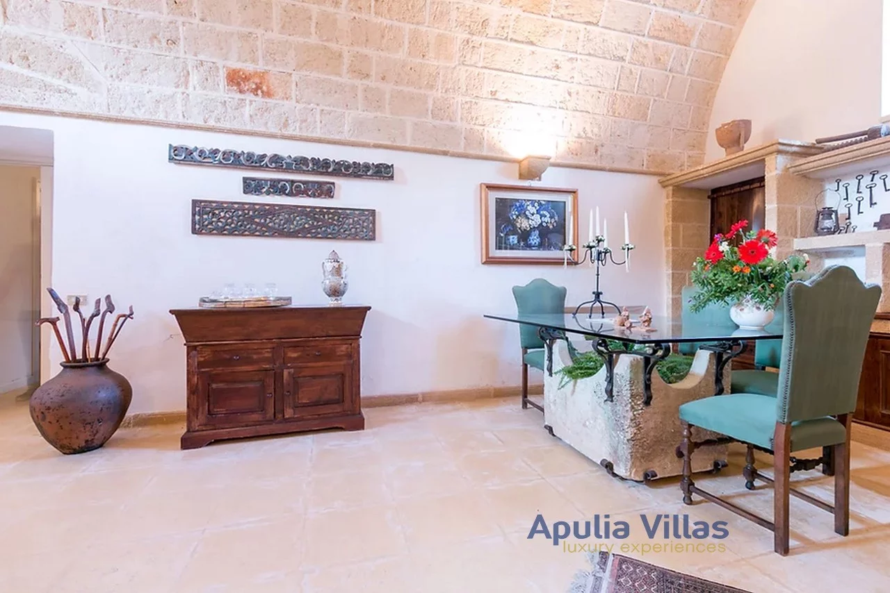La villa, privilegia la fusione di diverse arti e nuove generazioni, e mantiene per interno, grazie a un restauro conservativo, la propria anima salentina. Questo lo dimostra la presenta di porticati in pietra, vecchie aie, cortili interni, pozzi, forni, cisterne, e numerose nicchie.