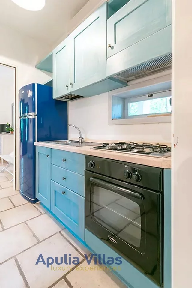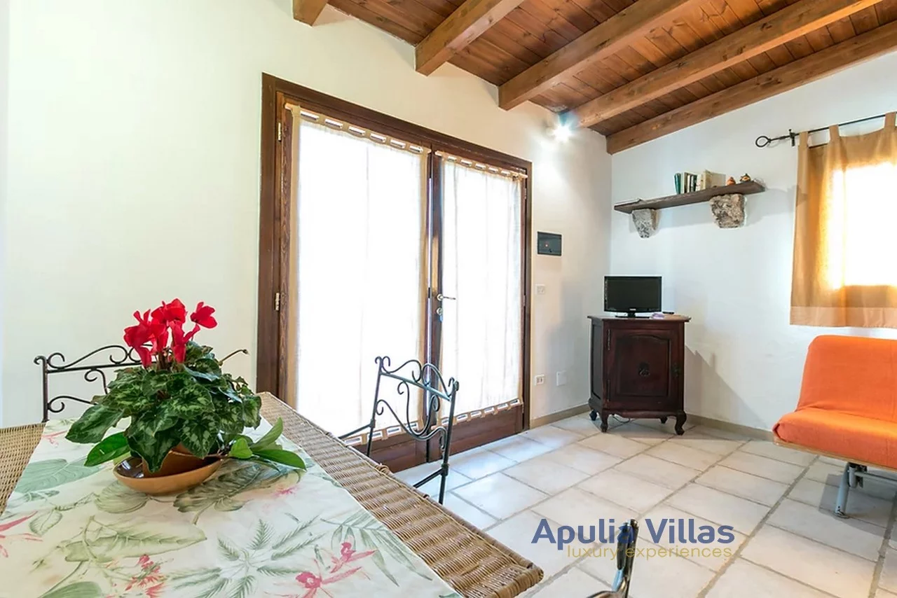 - TRILOCALE S. (60 mq. - posti letto 4+3): è composta da un soggiorno con angolo cottura attrezzato, tavolo da pranzo, e dispone di 2 camere matrimoniali e 2 bagni con doccia di cui uno in camera. Nel soggiorno sono presenti un divano letto matrimoniale alla francese e su un soppalco, un letto futòn (una piazza e 1/2). La dependance si affaccia in un agrumeto chiuso da muro di cinta, e dispone di un pergolato attrezzato con tavolo e sedie da giardino.