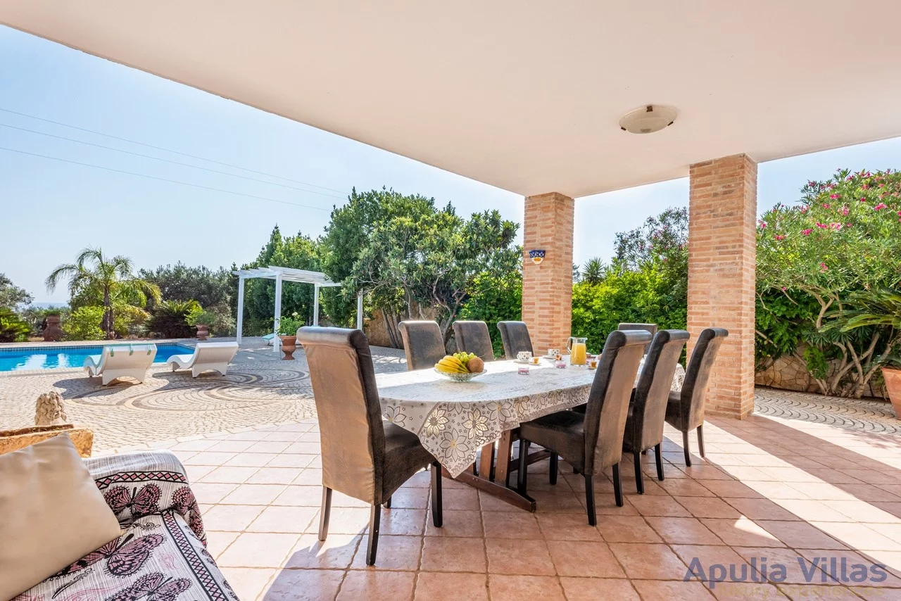 Nel cortile esterno, sono presenti due barbecue completi con un piano di appoggio e una pilozza, ideali per preparare grigliate e pasti all'aperto. Una scala conduce a un suggestivo belvedere da cui poter ammirare uno splendido panorama, con ulivi secolari e il mare all'orizzonte. La villa dispone inoltre di una lavanderia con lavatrice e stenditoio.