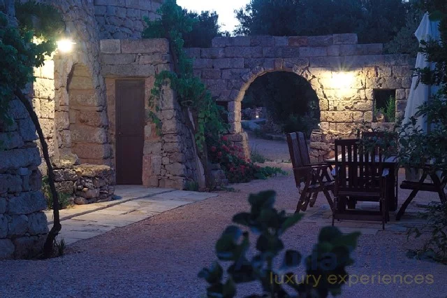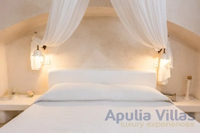 TRULLO (5+1 posti letto – mq 250) costituito da tre locali dalla tradizionale forma tronco conica, in cui sono situate le 3 camere da letto, ed una grande area adibita a cucina e sala pranzo con copertura in travi di legno e coppi in terracotta, e 2 bagni con doccia. Dotato di tv, wi-fi, sala con cucina e camino, lavastoviglie, lavatrice, asciugacapelli, cassaforte, allarme, riscaldamento, aria condizionata, ventilatore a soffitto, zanzariere, barbecue in muratura, patio esterno attrezzato, doccia esterna, stendi biancheria e mobili da giardino, posto auto.