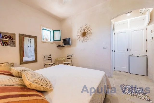 MONOLOCALE (2 posti letto – mq 25): composto da 1 camera matrimoniale e 1 bagno con doccia. Non è presente cucina attrezzata, ma solo di un fornelletto e frigorifero. Dotato di tv, wi-fi, asciugacapelli, cassaforte, allarme, riscaldamento, aria condizionata, ventilatore a soffitto, zanzariere, doccia esterna, stendi biancheria e patio esterno attrezzato con mobili da giardino, posto auto.