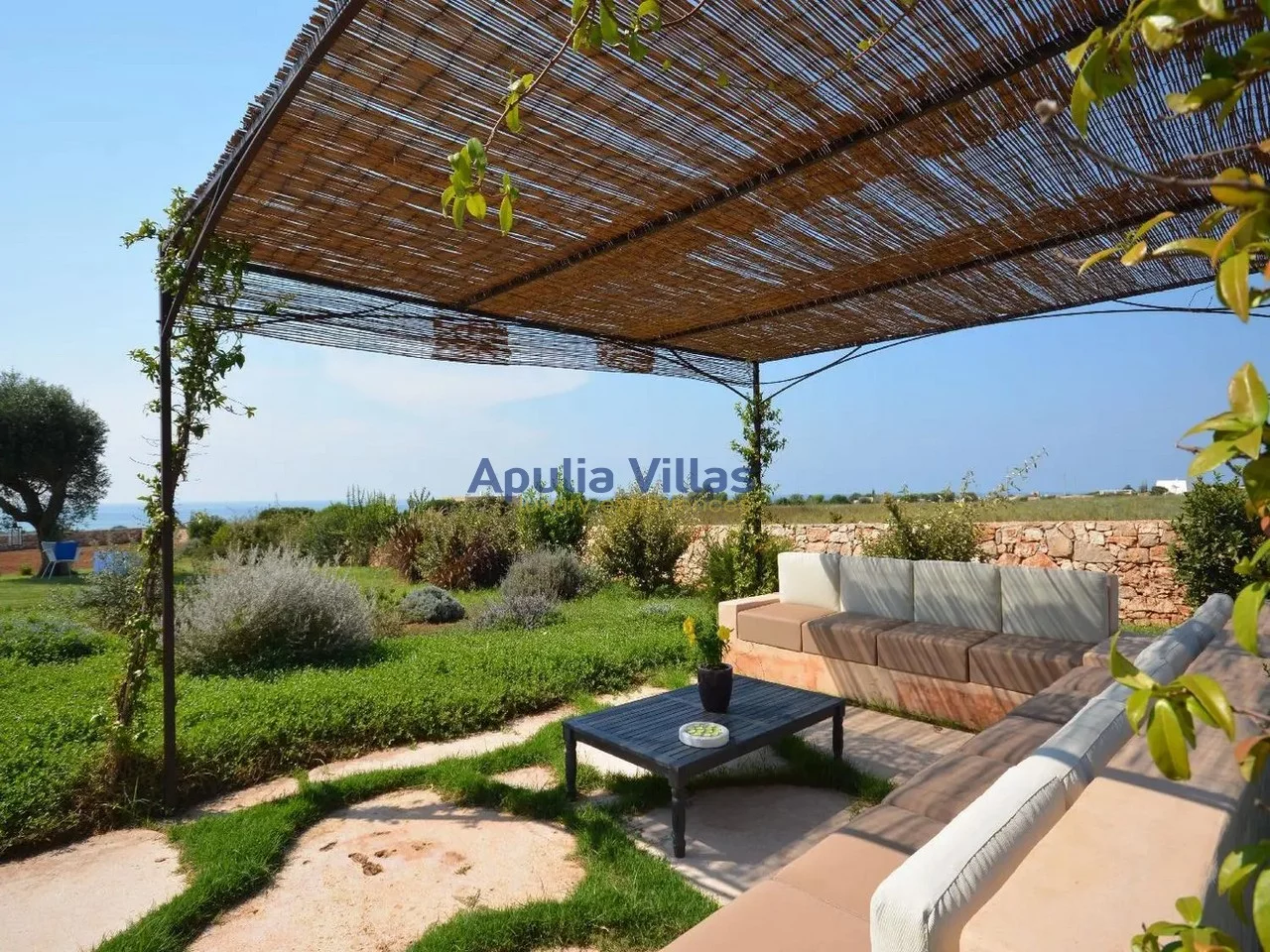 All’esterno, la villa offre un vero e proprio angolo di pace e bellezza. Una pergola ombreggiata con divani in muratura affacciata sul mare è il luogo perfetto per rilassarsi al tramonto, leggere un libro o gustare un aperitivo. Il grande patio, pavimentato in pietra e arredato con cura, si affaccia sulla piscina incorniciata da pietra locale e prato inglese, con comodi lettini prendisole e zone d’ombra pensate per il massimo comfort. A disposizione degli ospiti anche una zona pranzo all’aperto con barbecue.